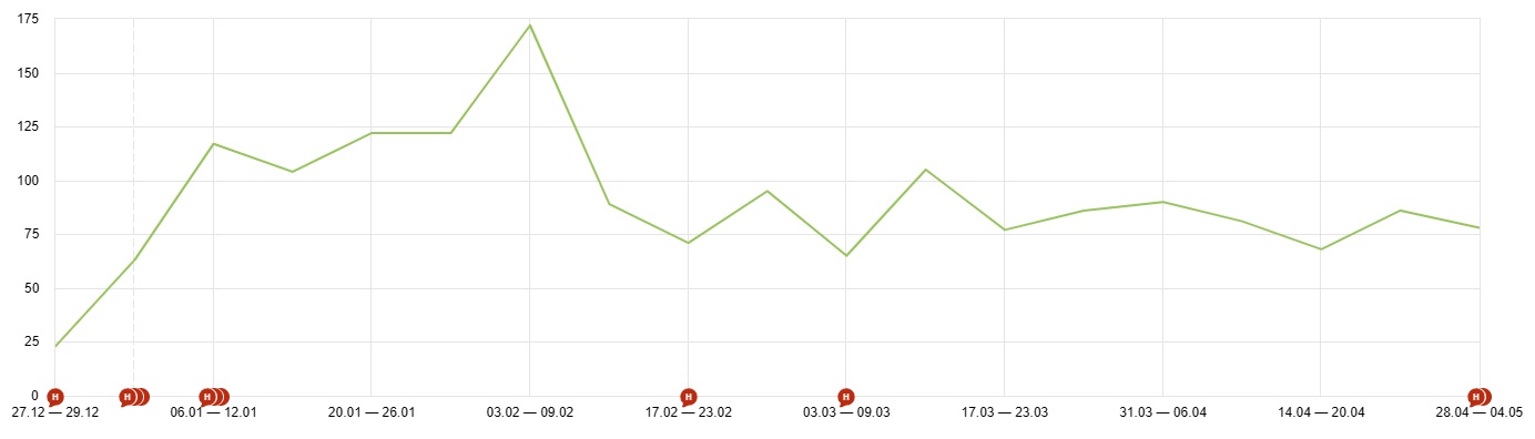 Вот так выглядел рост трафика из поисковых систем для нашего клиента. Самое начало графика – это взрывной рост с момента, когда мы развернули наш «Нейросайт» на базе клиентского домена. Потом идет выравнивание трафика на средних значениях, от которых начнется постепенный рост.