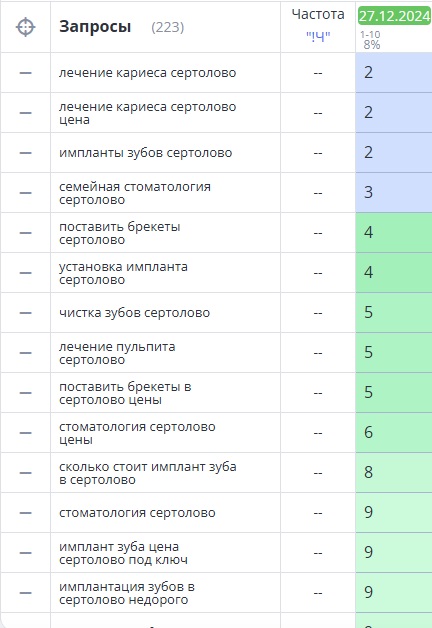 Стоматология «Медея» в Сертолово была практически не представлена в поиске. Всего у нее было 8% или 18 запросов в ТОП-10 на 27.12.2024. Это очень мало для небольшого города на 72 000 человек.