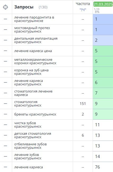 всего 55 000 человек. У клиники было всего 10 запросов или 8% от общей массы в ТОП-10 на 21.03.2025. В основном